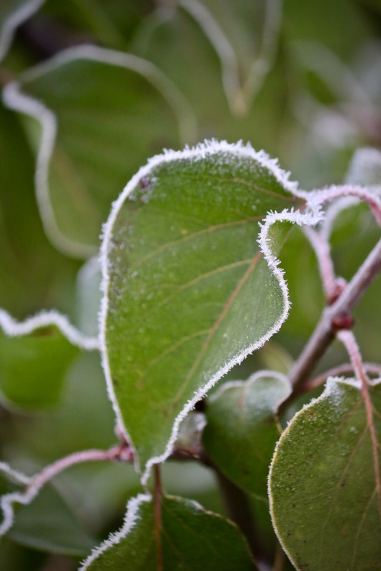 I have two lilac trees in my yard. One has grown from a clipping from an ancient neighbouring tree and the other from a greenhouse. The ancient one loses all its leaves quickly, the greenhouse one still shows its green leaves in late October. The other day I caught the light on those leaves and they looked rimmed in silver by Jack Frost or, in less poetic terms, like the salt rimmed edge of a margarita glass. It was late morning by the time it caught my eye and was beginning to thaw. My camera is never far from my hand and I put on my winter jacket and headed into the yard. Not the Aurora but certainly a moment to be enjoyed and captured.