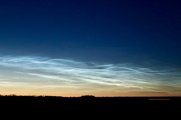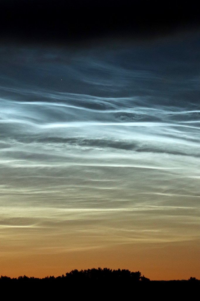 *Noctilucent clouds are a cloud-like phenomena high in the upper atmosphere of Earth (65-80 kms up). They are too faint to be seen in daylight, and are visible only when illuminated by sunlight from below the horizon while the lower layers of the atmosphere are in Earth’s shadow. They are visible only during the summer (I’ve seen them into mid July) during astronomical twilight (the Sun is below the viewer’s horizon but the clouds are still in sunlight) – from latitudes between 50° and 70° north and south of the Equator. Ardmore is at 54°N (Calgary is at 51°N). Unlike the Aurora…they are just there…moving, but imperceptibly so and hanging out until the sun sinks too low below the horizon.