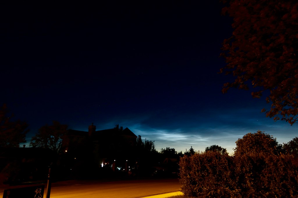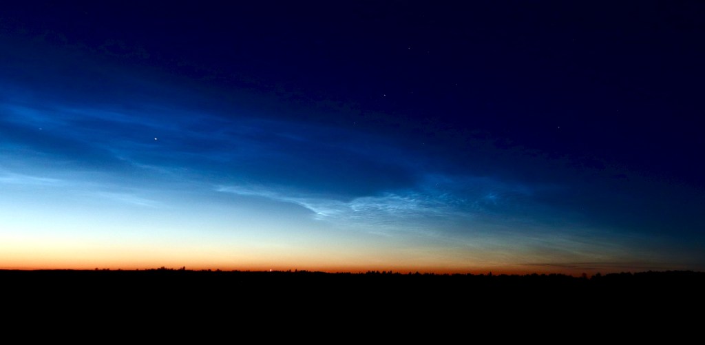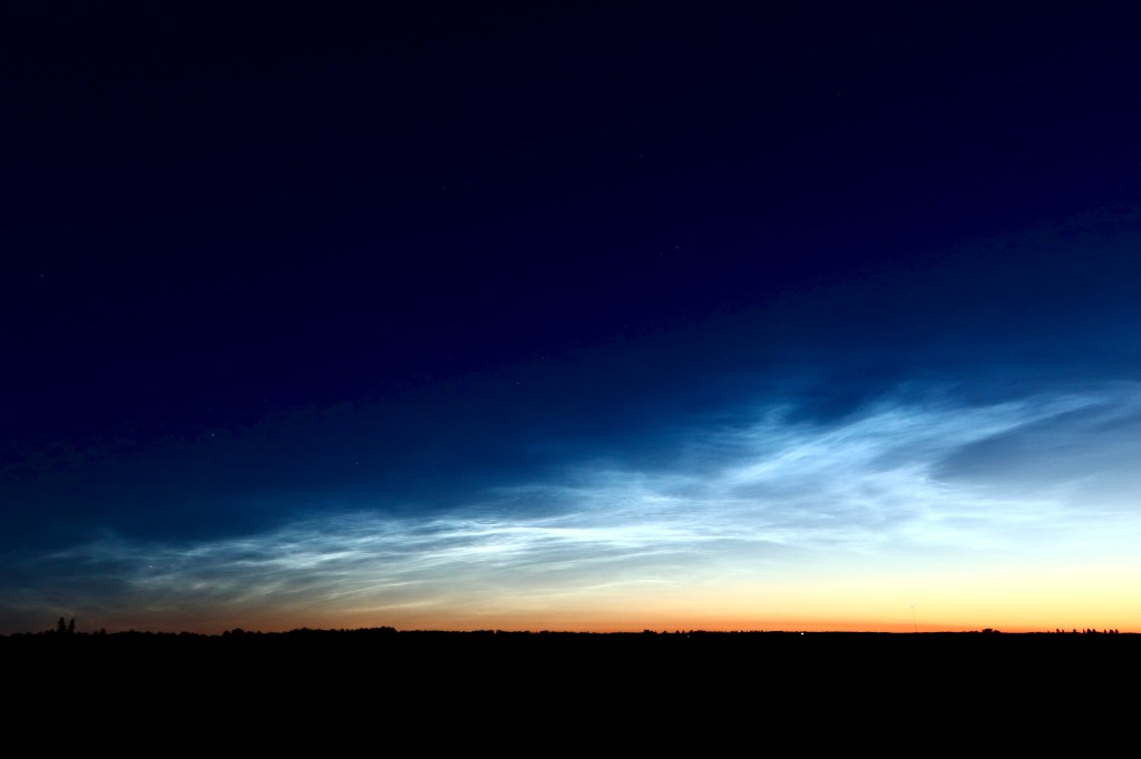 It’s truly all in the perspective. Recently I was saying to my husband “yay! next week it will be the longest day and then the nights will start getting longer!” (it still surprises me when I hear myself say that). A few days later came the longest day – June 20th. Sitting by the fire, marvelling at how light it still was and knowing there would be no star-gazing this night. And then it happened…looking up just after 11pm and seeing what I think are very-faint-in-the-still-light-sky Noctilucent Clouds. The sky needed to darken more to be sure, but just after midnight I could confirm that indeed, I was looking at a beautiful display of NLC’s. This night was crystal clear – not a real cloud in the sky. Off I went on a short jaunt down the road with my camera in tow to find a horizon. They were so lovely – almost as mystical and magical as the Lady Aurora herself. At this time of year, and lasting only a few short weeks, the sun is at just the right trajectory below the horizon to light up the ice crystals formed by meteor vapour 85kms up in the earth’s mesosphere. They are not true clouds and often give the illusion of watery waves in the sky. A thin line of orange sunset still showed on the horizon as the sun skimmed just below, ready to reappear only a few hours hence. Maybe there is something to be said for those long summer nights after all – revealing treasures that would normally go unseen by the human eye. Nature does like balance after all.