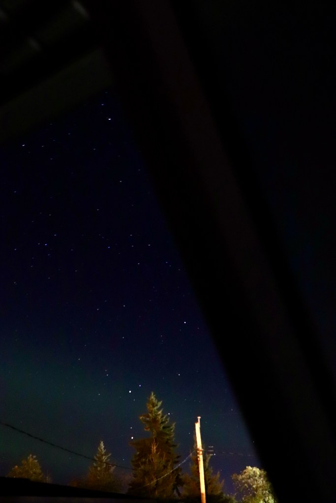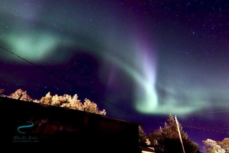 The early morning of September 8th was amazing and so unexpected. The space data had been teasing all evening and at midnight when I checked the data it showed some potential, but by no means imminent, so off to sleep for me. I awoke at 1:30am and just got a strong feeling I should look out the window. Nothing seemed to indicate that it was worth taking any test shots and I was barely awake. I didn’t see any green or tell-tale wisps with the naked eye, and very nearly went back to bed – except that the constellation Gemini grabbed my attention. Now somewhat alert but not inclined to head outside, I popped the screen on the bathroom and tried to image the constellation from there – which had disastrous results (not surprisingly). However, I did notice a very faint green to the north and that in every subsequent snap, the green was getting more and more pronounced. That was all I needed. I was now wide awake, throwing on clothes, herding cats to a room so they couldn’t escape during my maneuvers, and headed onto my deck with my gear. The Lady was truly dancing and the sky was beginning to explode. Decisions had to be made…do I stay or do I head down the road for a clear horizon? As she was pretty much overhead and often blows out just as fast as she came in, I decided to stay put in my yard. The sky just simply went nuts. In all the times this has happened, I still cannot find adequate words to describe it. Pictures don’t even come close – so much movement in the sky! Finally I threw my gear into the car and went as far as the local fishpond by which time she devolved into a huge sheet of colour. In that photo you can see a clear delineation between the aurora and the night sky…you would think this light would spill everywhere and light up the entire sky…but no, it’s almost like the Aurora hit an invisible wall. It was after 3:30 am, something was rustling in the bushes, and my nerve left me. I headed back to the house where I stood once more on my deck watching the last of the dance play out directly over my head. I figured she was not finished for the night and would likely power up again, but my bed beckoned. A few times during this process I was miffed at myself for not heading directly for a horizon – surely my neighbourhood and street lights and building would not have been an attractive component to my shots and would not do the Lady any justice. Later, when I downloaded my photos, this thought was disproved. The urbane backdrop added a wonderful perspective to the aurora. It helped to anchor the immenseness of the aurora better than any wide angle horizon shot. As always I am in awe of Mother Nature and no matter how many times I experience the Aurora in all her myriad presentations, I never tire of the dance. The energy and adrenaline that never fails to course through me after these events helps to get me through the day after a sleepless night, but I’m still grateful this night was followed by a day off…whew!