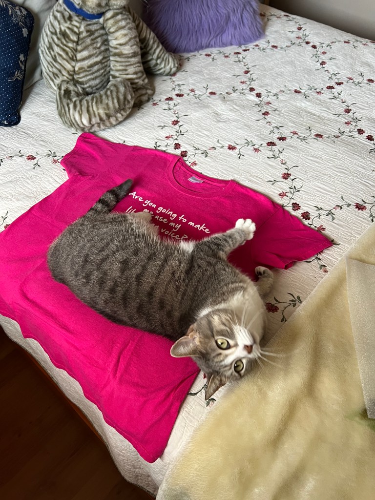 Note: I still have my issues…when I went to post a pic of the shirt, I was acutely aware of the wrinkles it sustained from being folded in my closet. I was instantly reminded the wrinkled white blouse from the laundry hamper 54 years ago. I found I could not bring myself to post it so, firstly, I tried using photoshop to remove the wrinkles but as I am not adept at doing that, abandoned the effort and went in search of my iron. The wrinkles were quickly and easily removed but it’s not so easy to smooth the mind. Bella seemed to like it wrinkles and all, which makes me love her even more.
