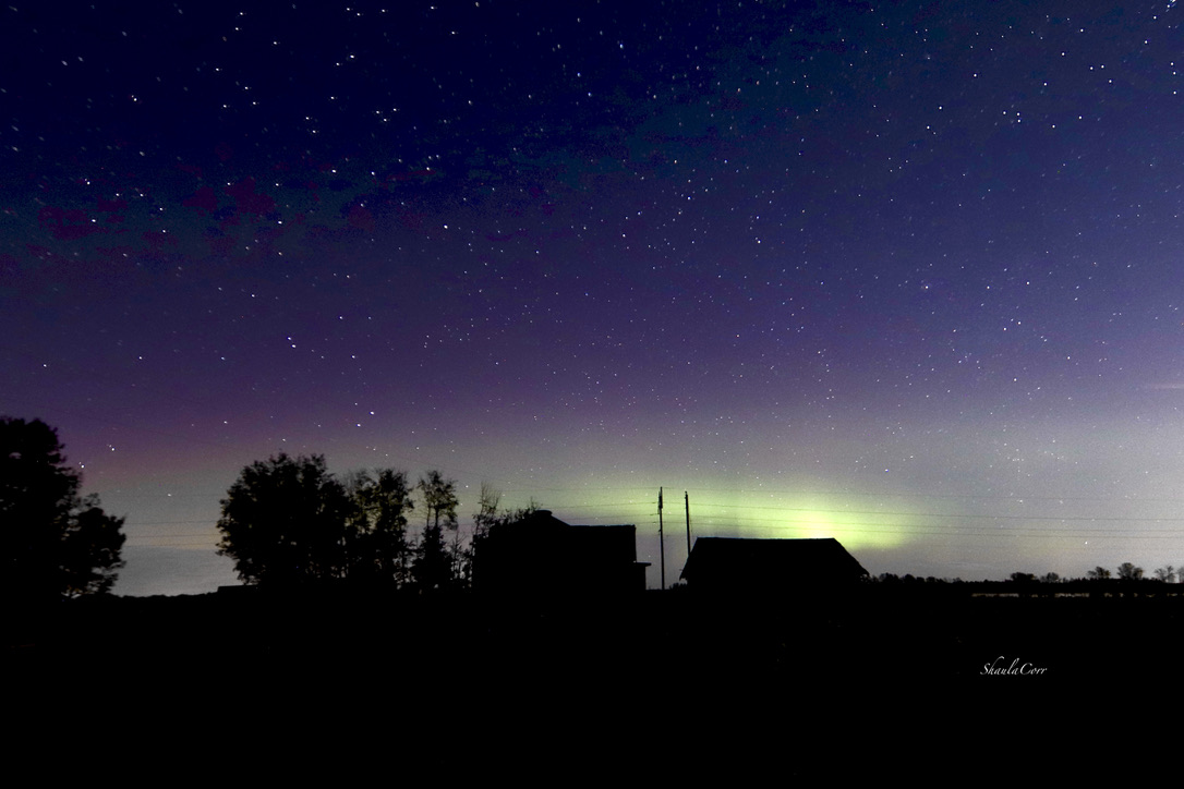 A lazy aurora showed turning the night sky a beautiful purple and bright green making for a beautiful scene over these farm outbuildings.