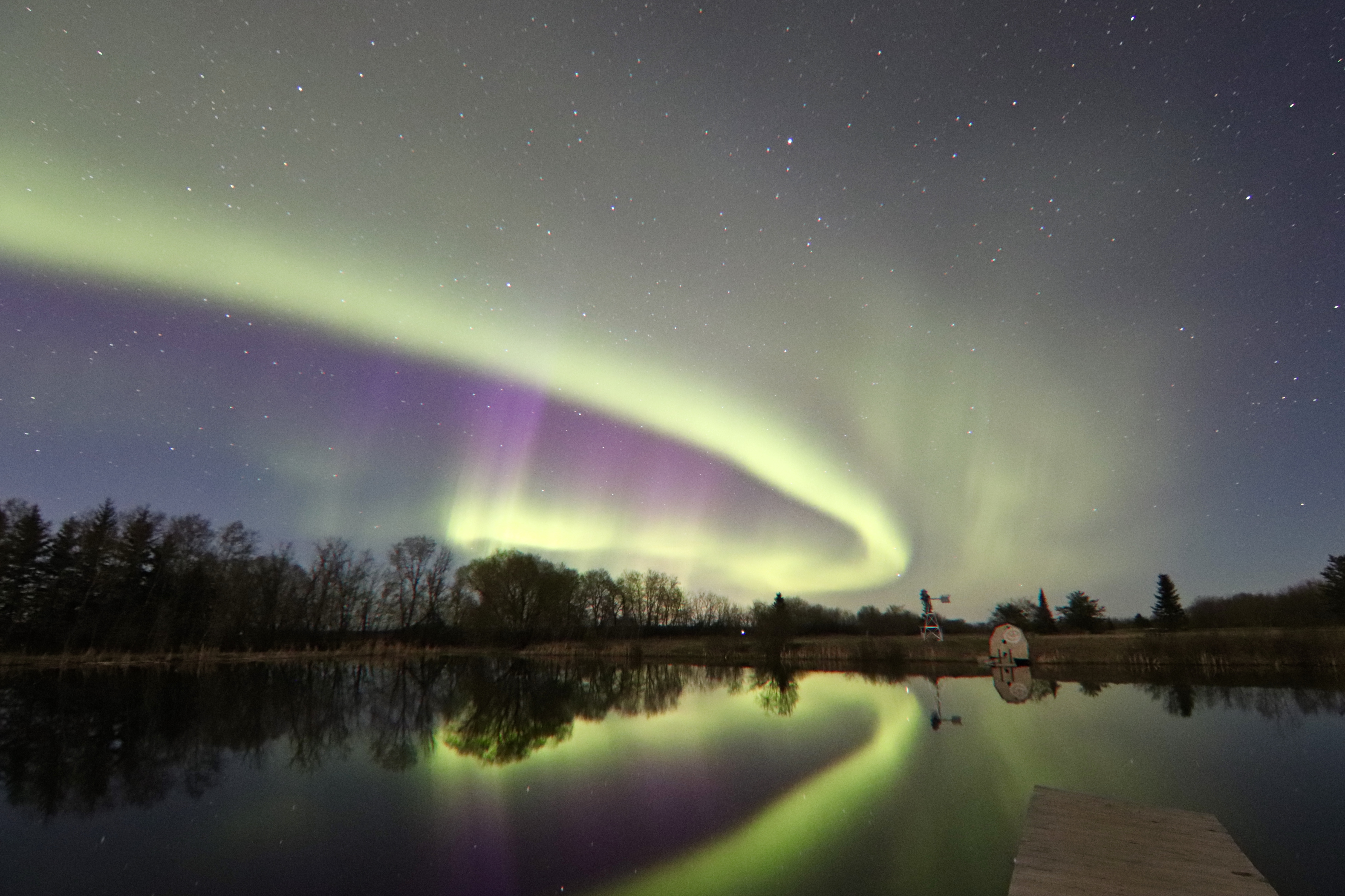 The Lady Aurora reflects onto a calm fish pond with the purple and greens making me wonder if the fish were as mesmerized as I was by this amazing show.