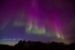The bright fushia aurora trimmed in green gives the illusion of a skirt hem brushing away the last wisps of cloud in her path.