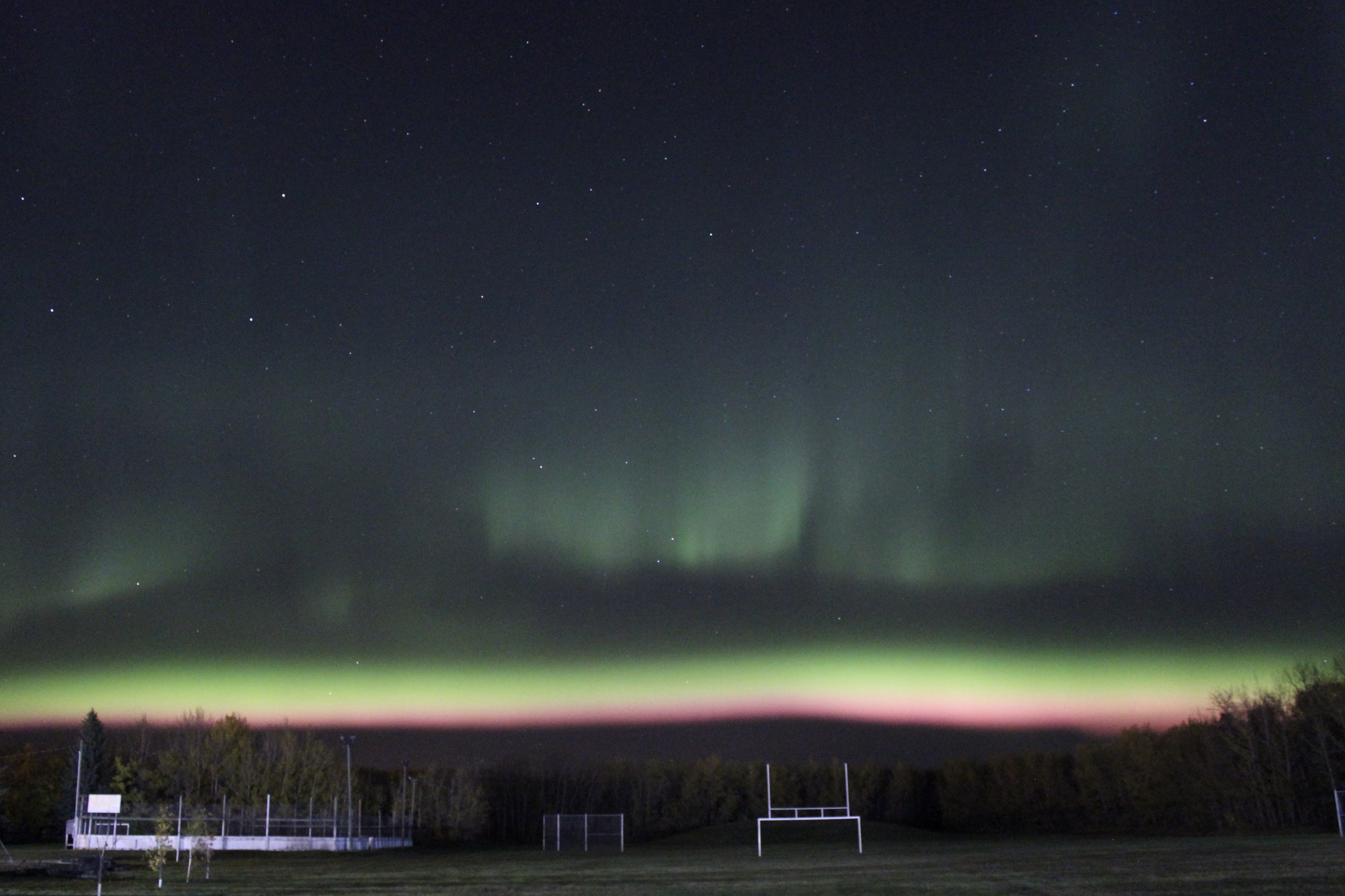The Lady aurora took on the colours of a discarded watermelon rind while hovering over the local schoolyard in this night sky photo. The goalposts give some perspective to the massive show that it was.
